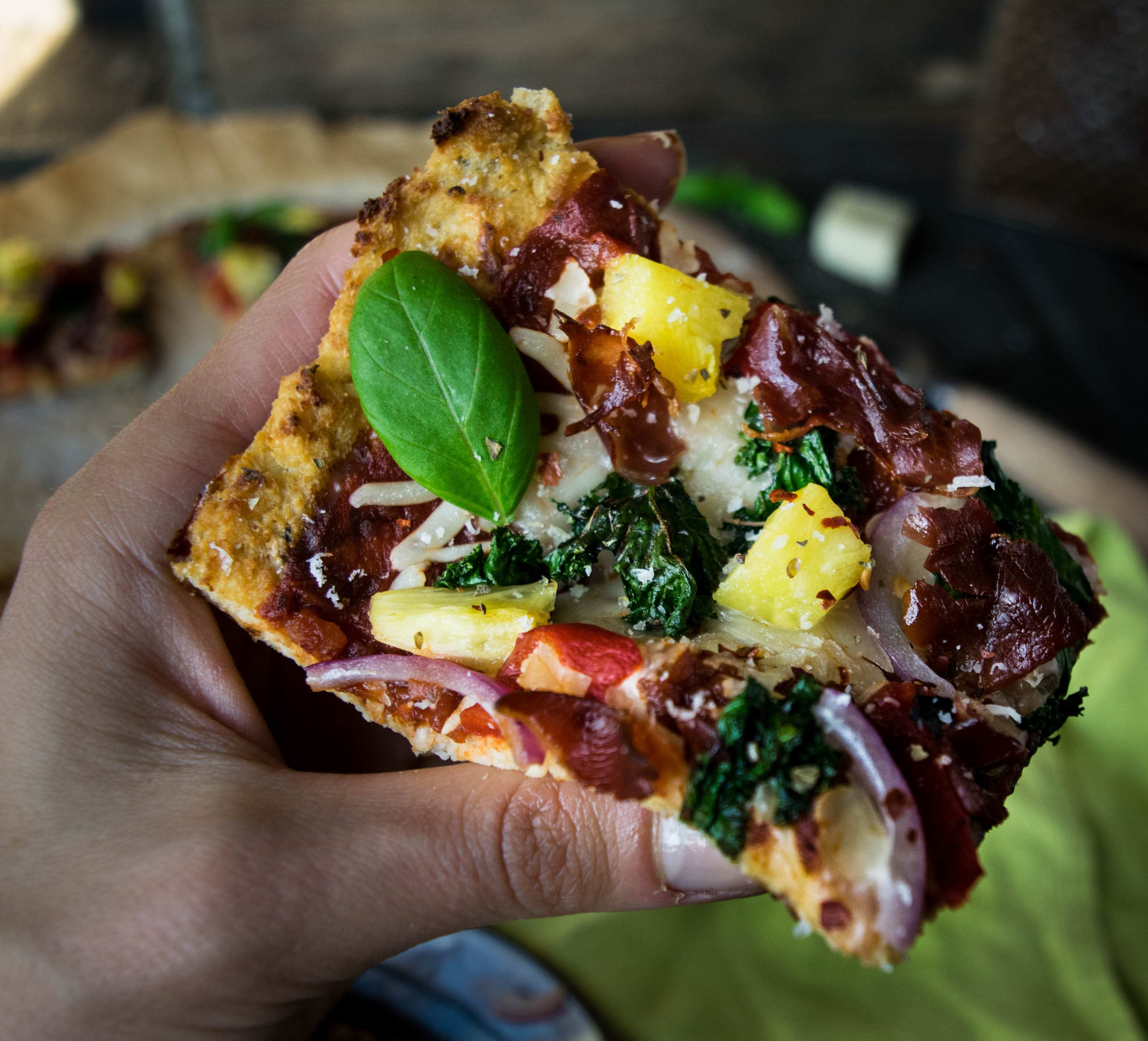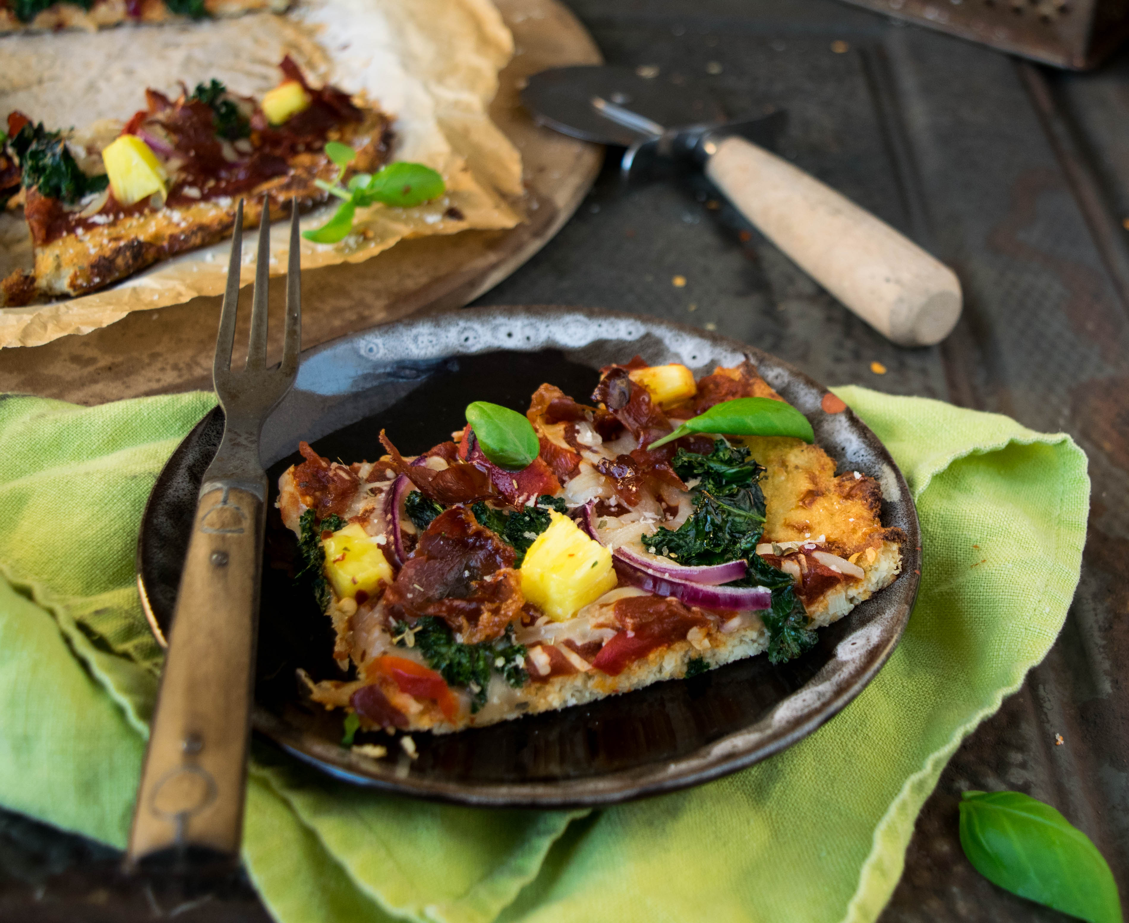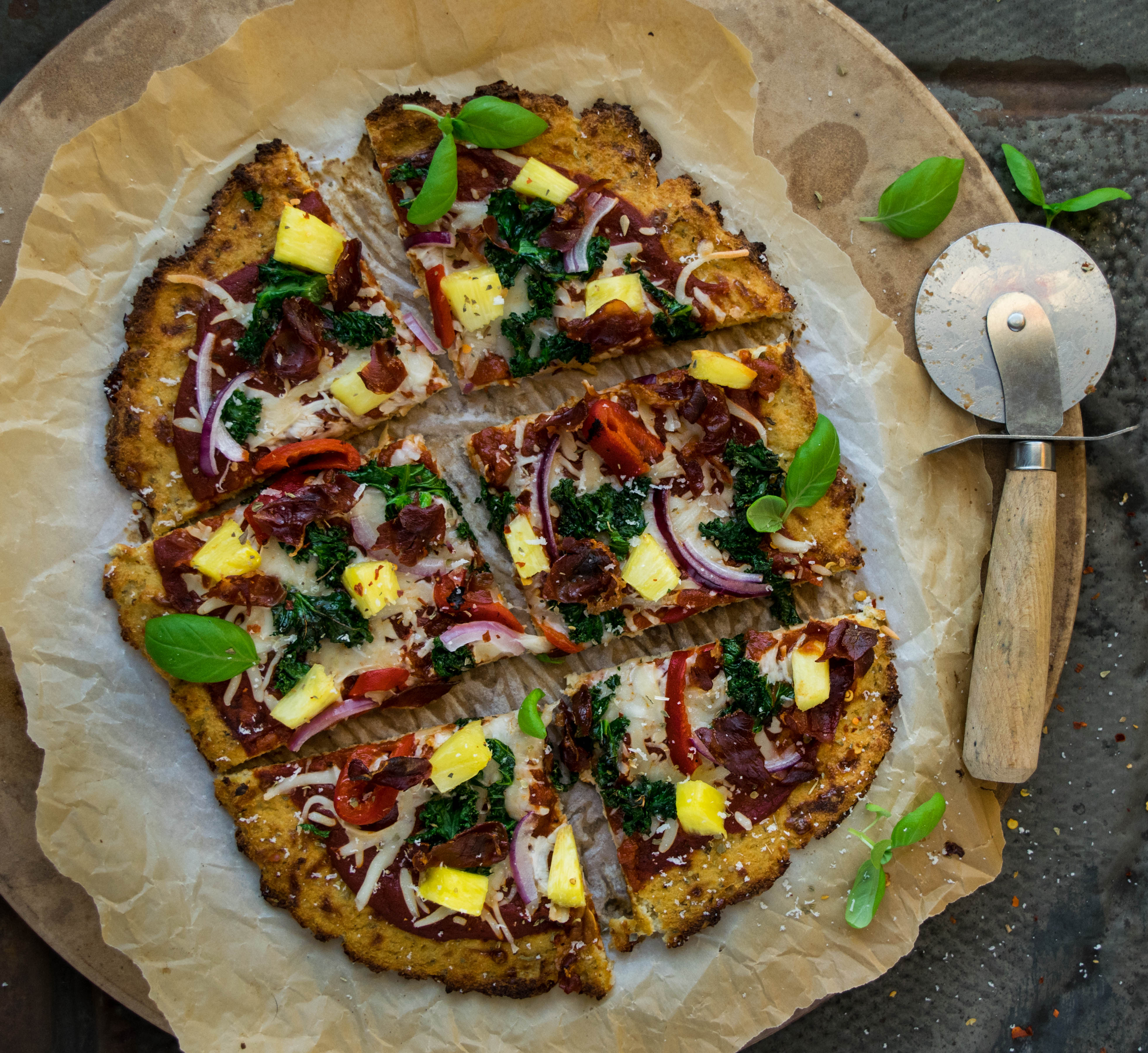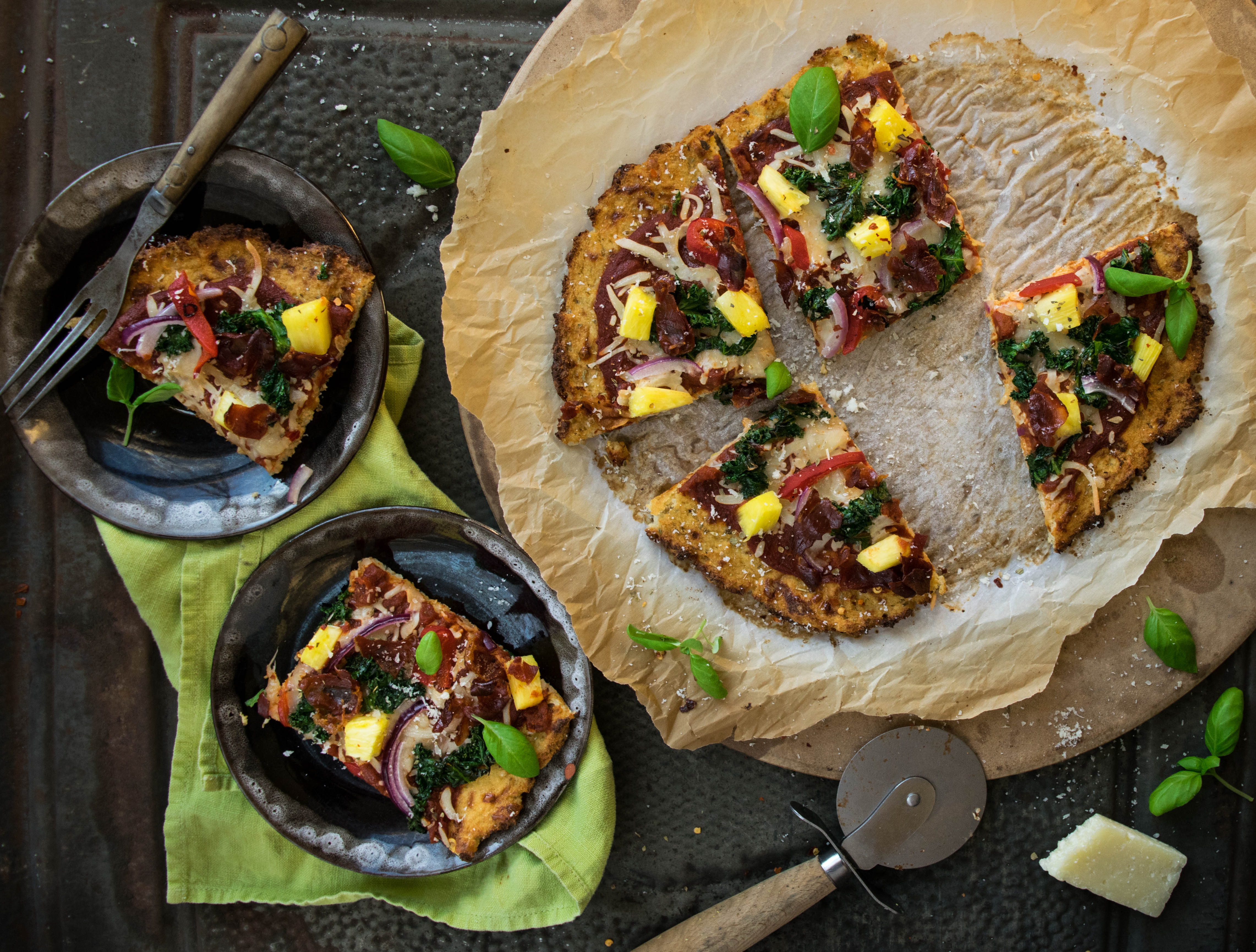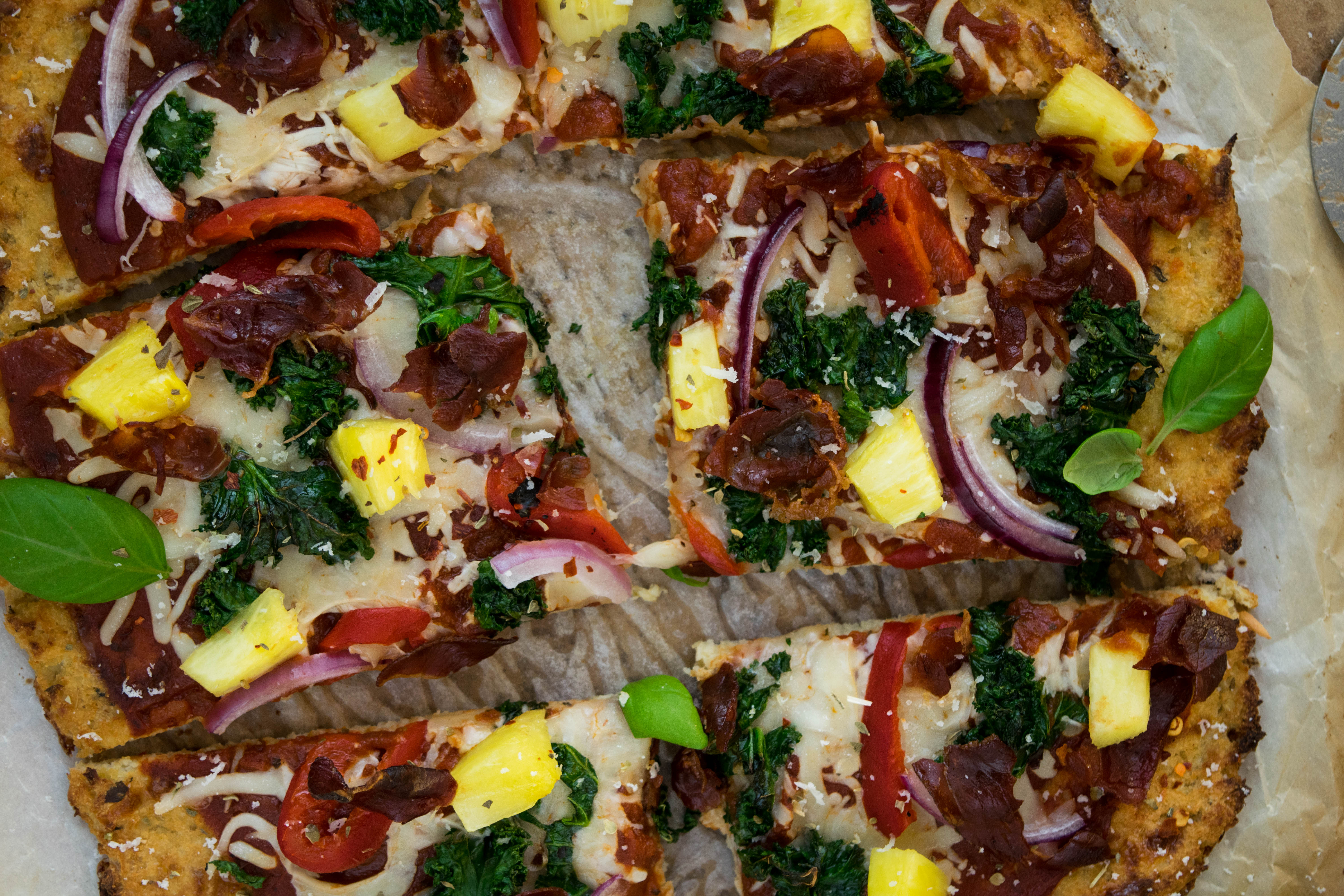 Cauliflower Crust Hawaiian Pizza with Crispy Prosciutto, Kale, and Roasted Red Pepper