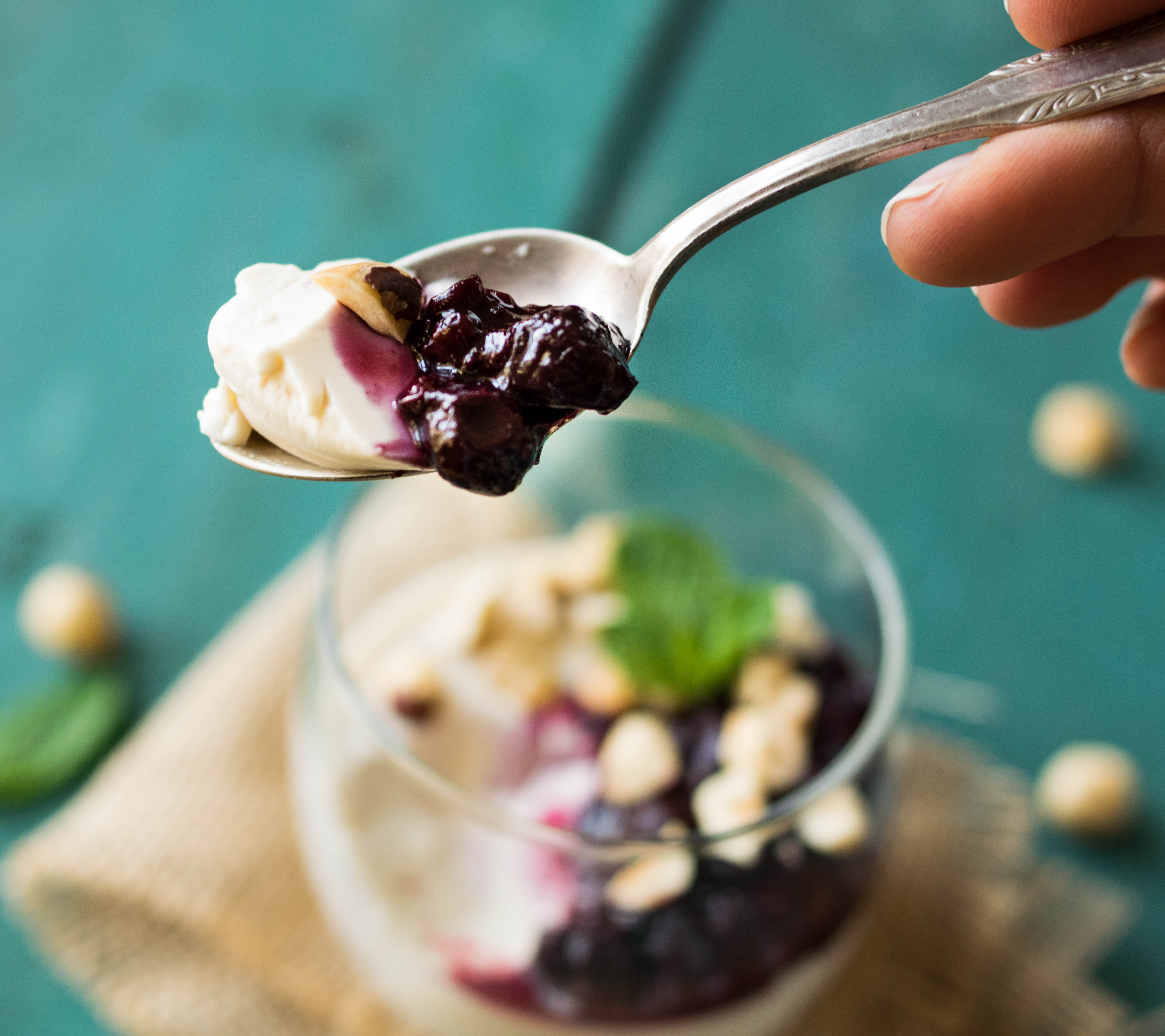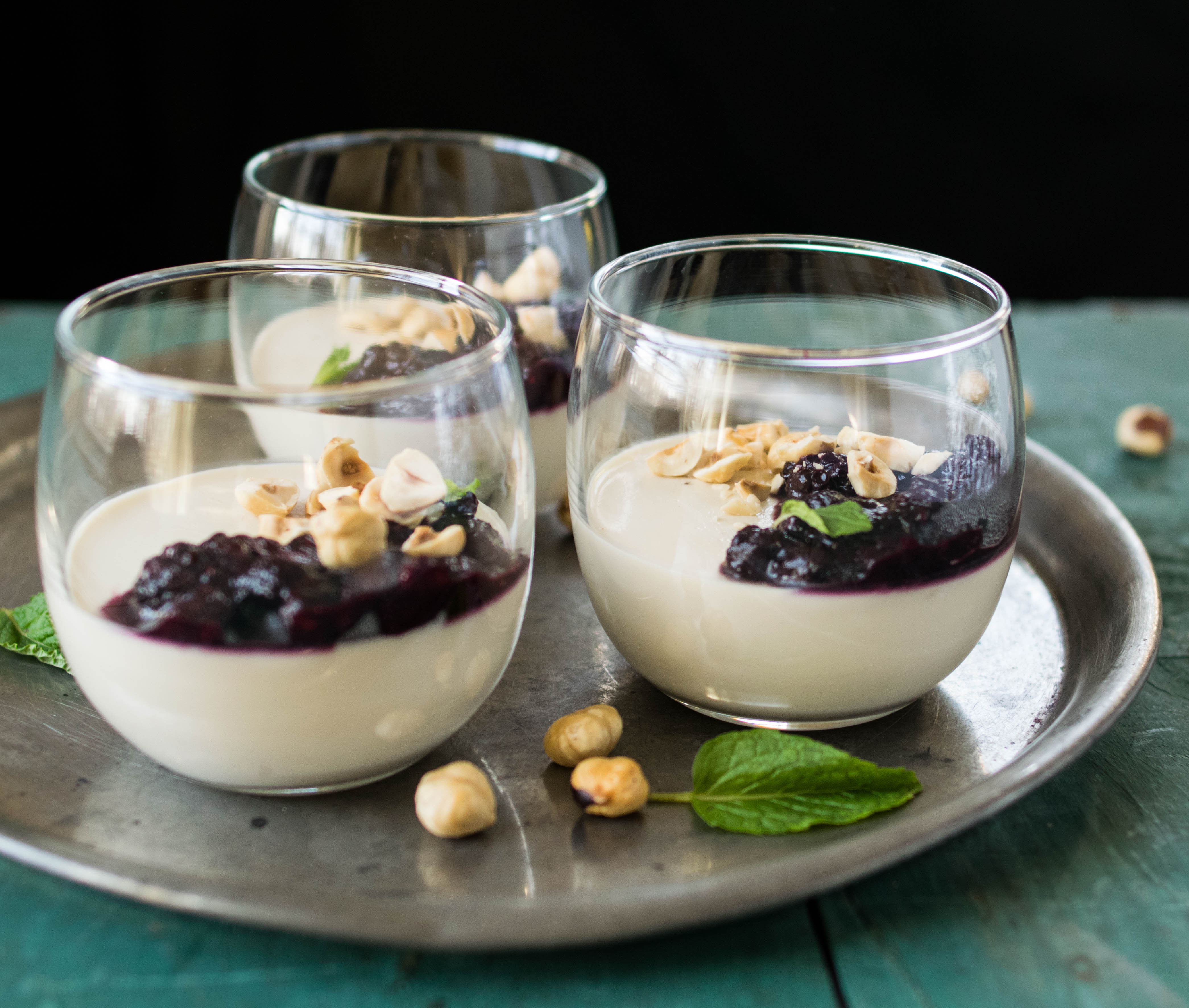 - Right before serving, spoon compote over chilled panna cotta and sprinkle with hazelnuts.
