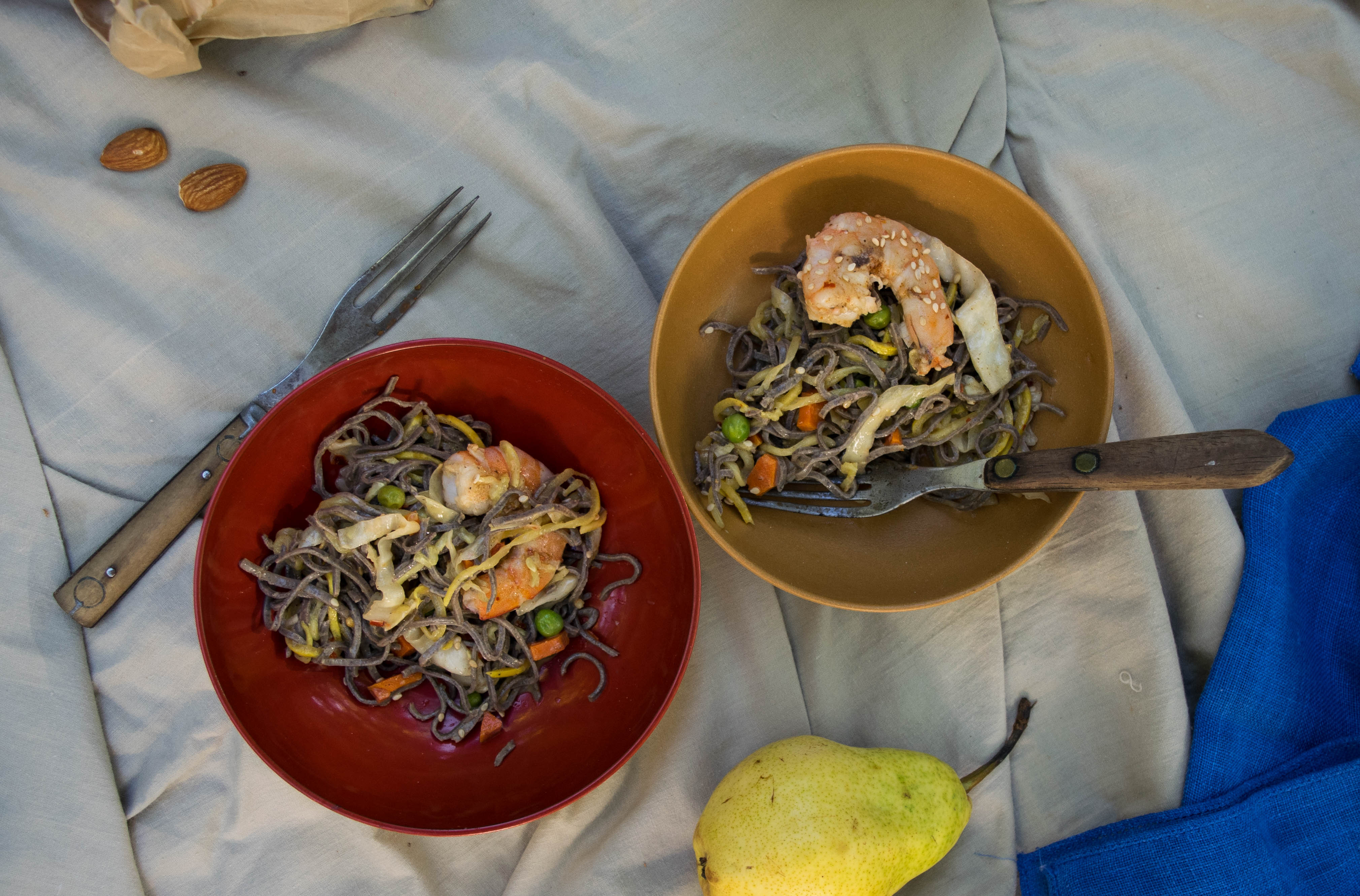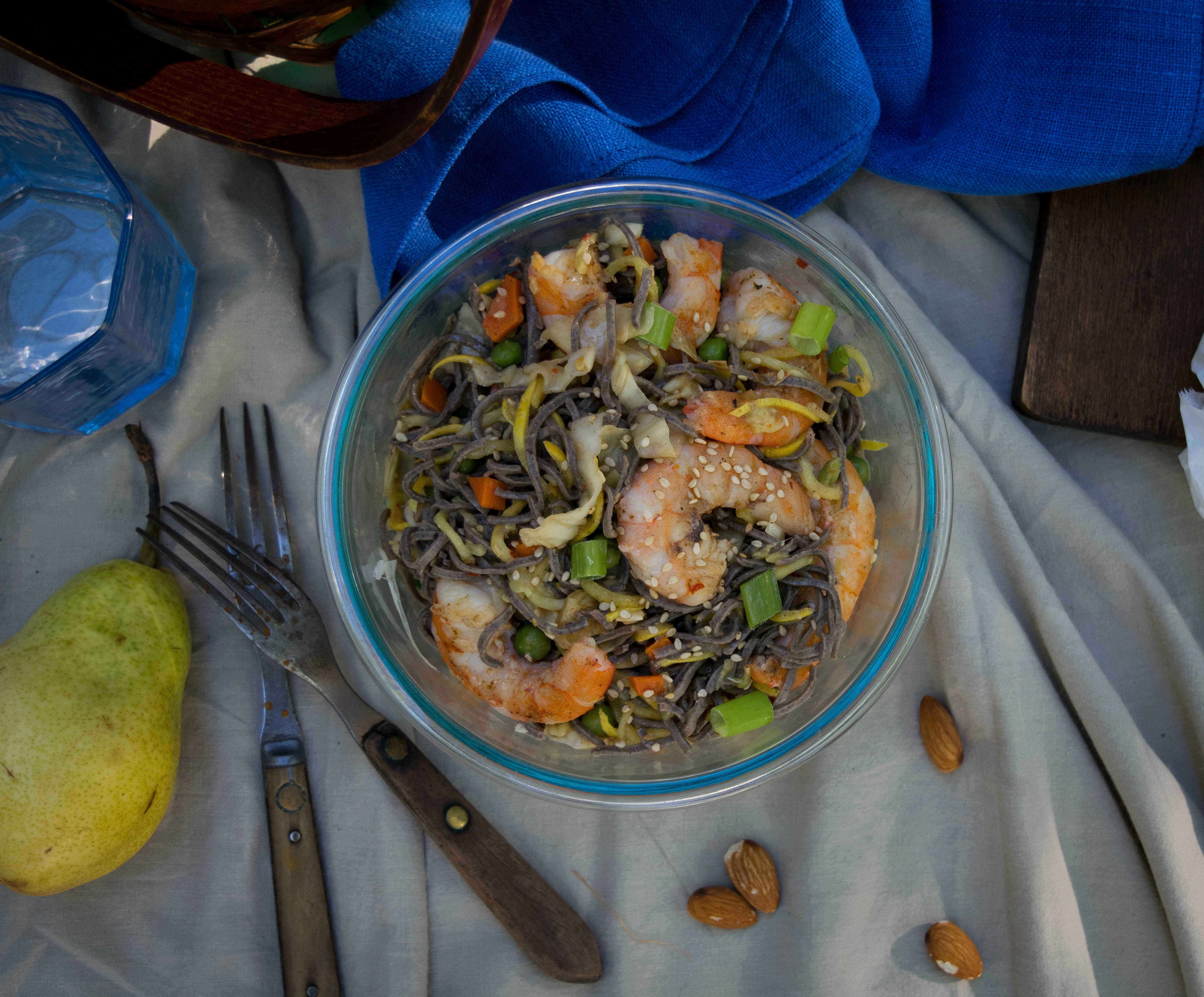 Those noodles are one of my favorite things, by the way. Made of one ingredient: black beans. How do they get black beans to look, taste, and bite like a noodle? Don’t ask me. But they are amazing. Twirl in some zoodles and almond sesame dressing? That’s elevated picnic provisions for ya.