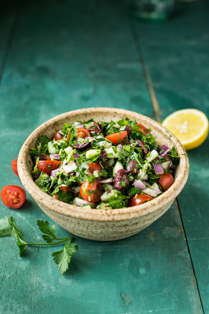 The olive tabbouleh is perfect to make ahead of time because the flavors really develop after they’ve snuggled up for a while. It’s also a great way to use up a bunch of parsley that you have sitting in your fridge, just in case you too are plagued by the same use-it-or-lose-it mentality that I am.
