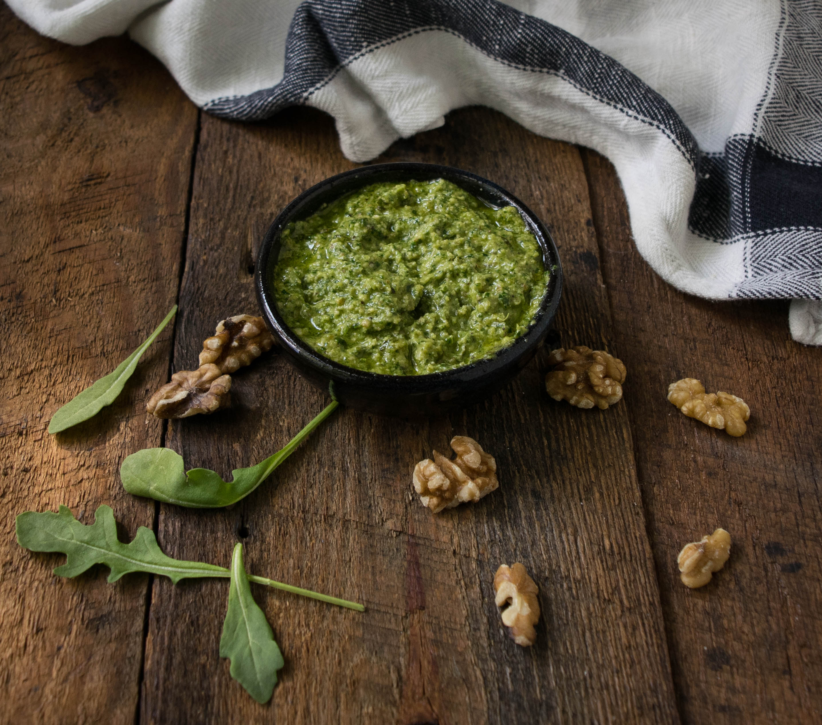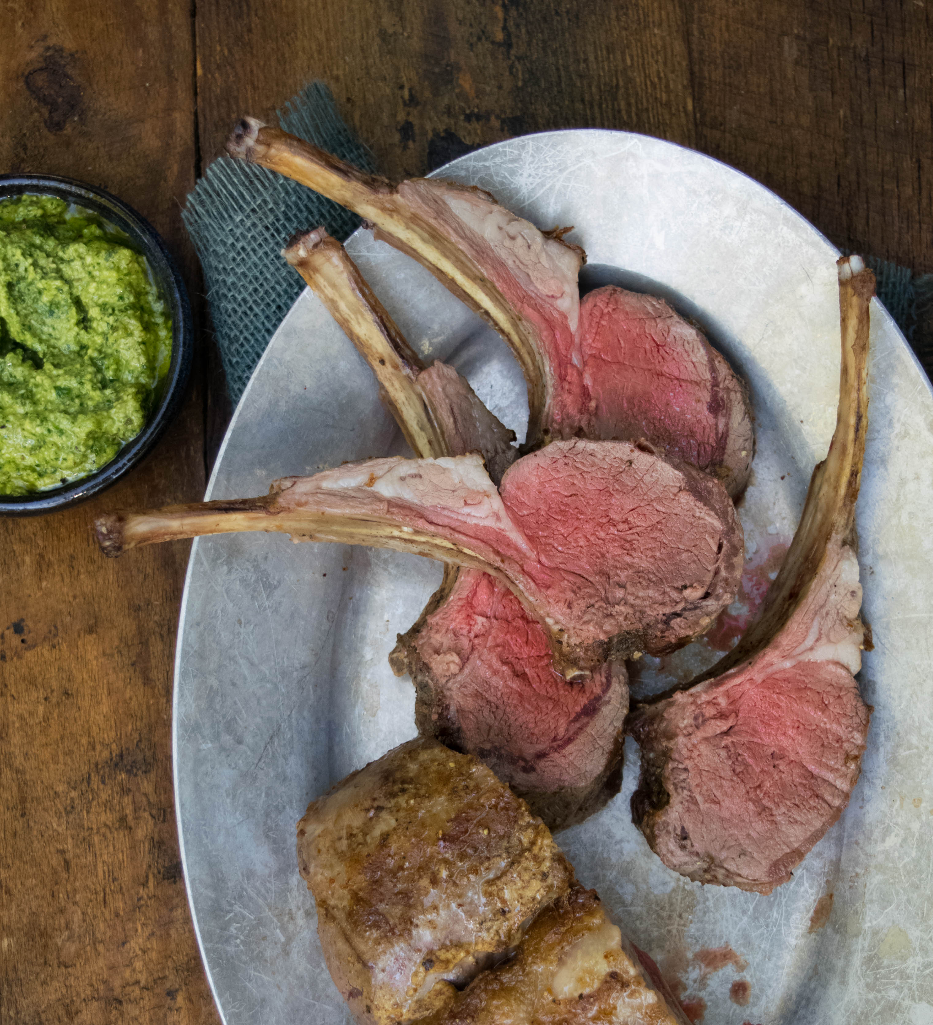 - After letting meat rest for 10 minutes, slice into chops. Serve with pesto and a drizzle of sauce.