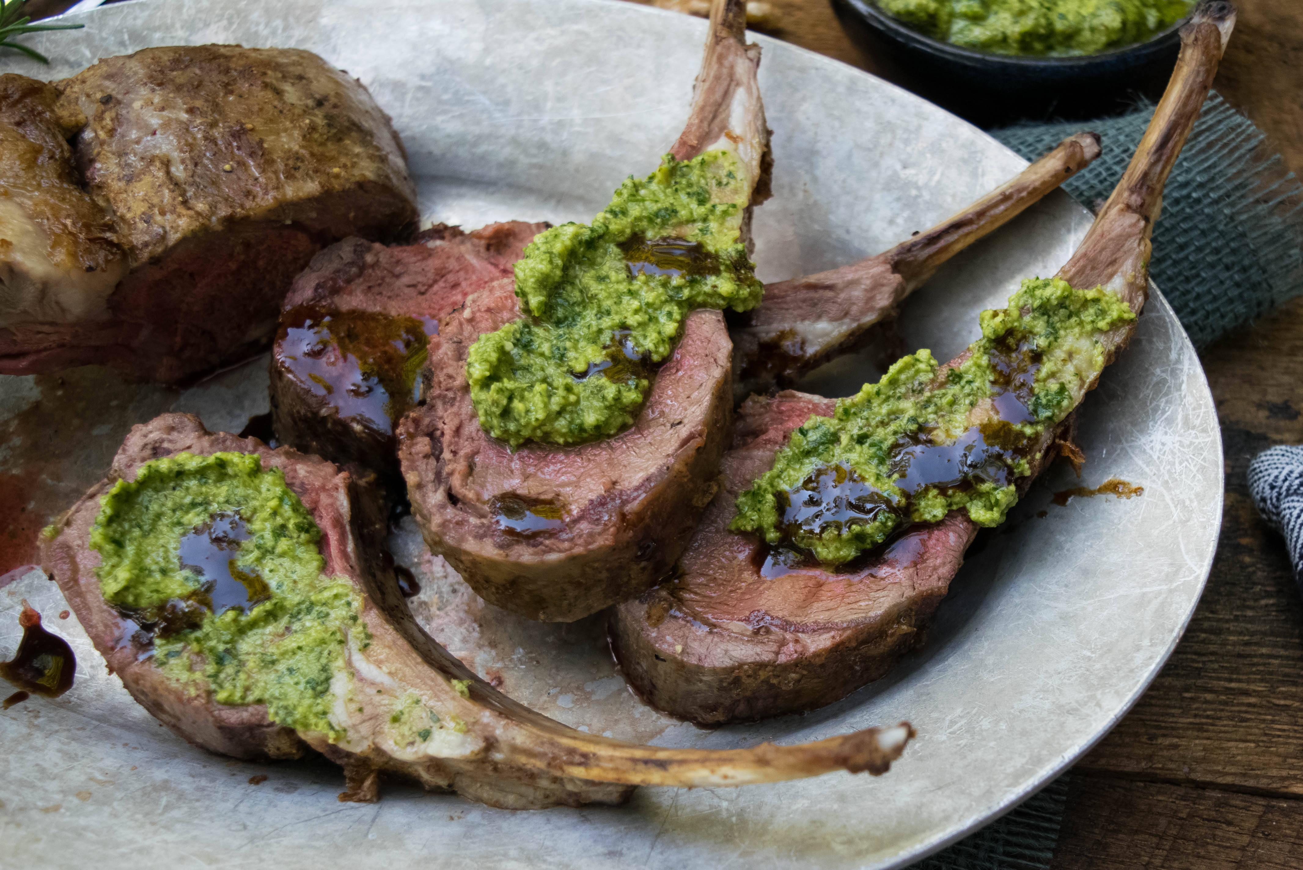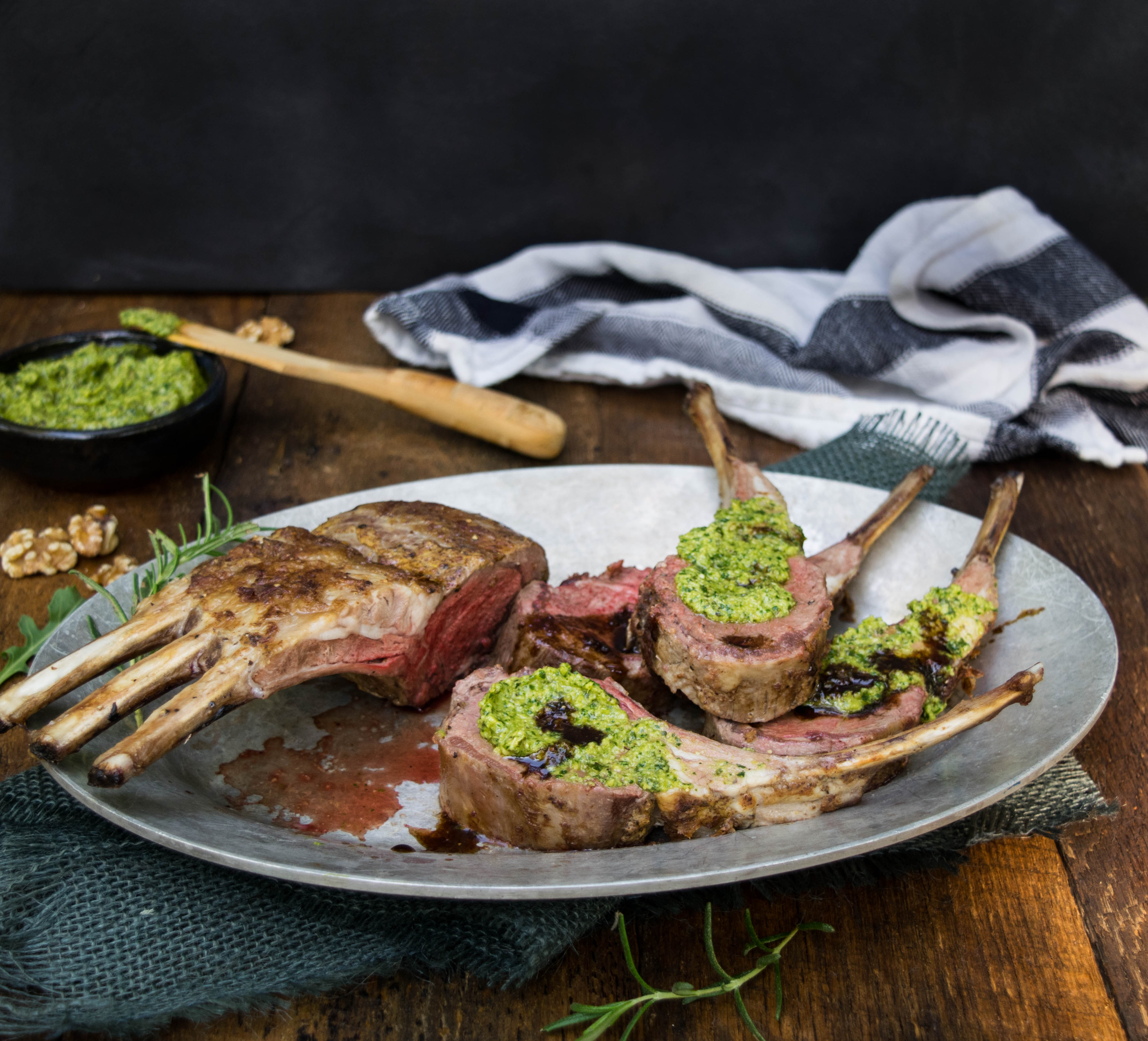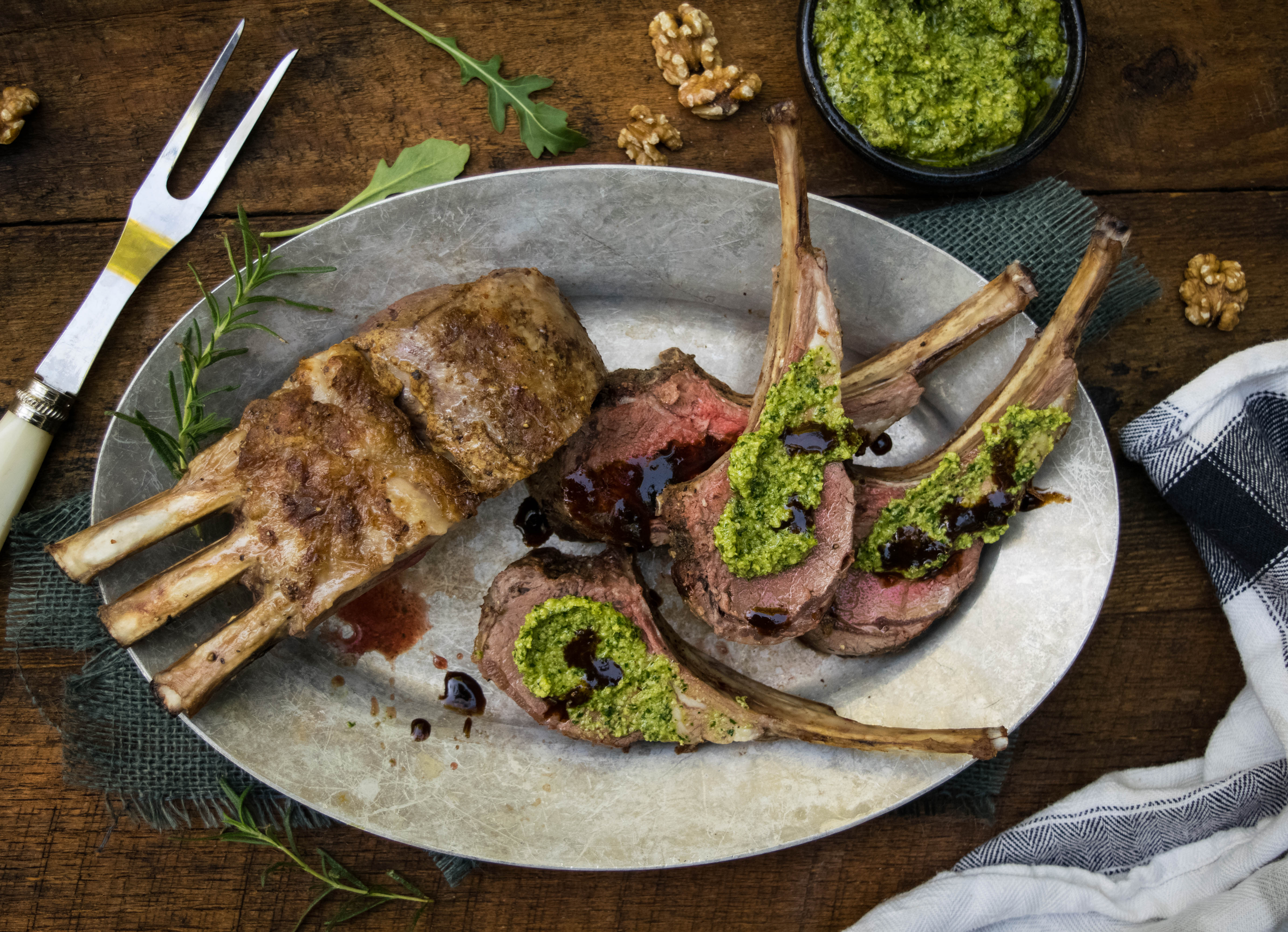 Rack of Lamb with Arugula Pesto and Orange Balsamic Drizzle