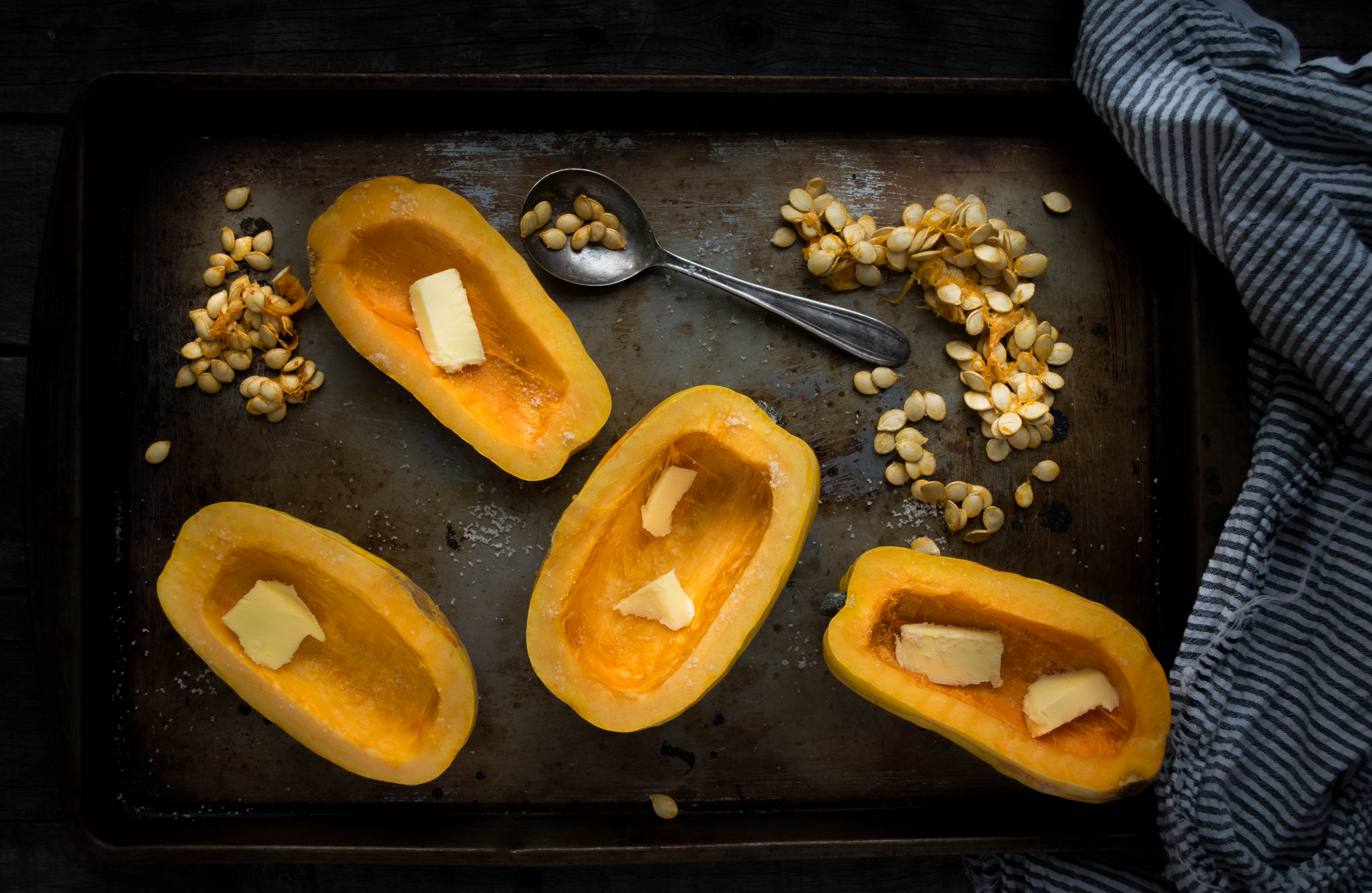 - Place squash boats skin side down on baking sheet. Dot with butter and sprinkle with salt. Roast for 45 minutes, until soft when pierced with a fork and lightly caramelized.