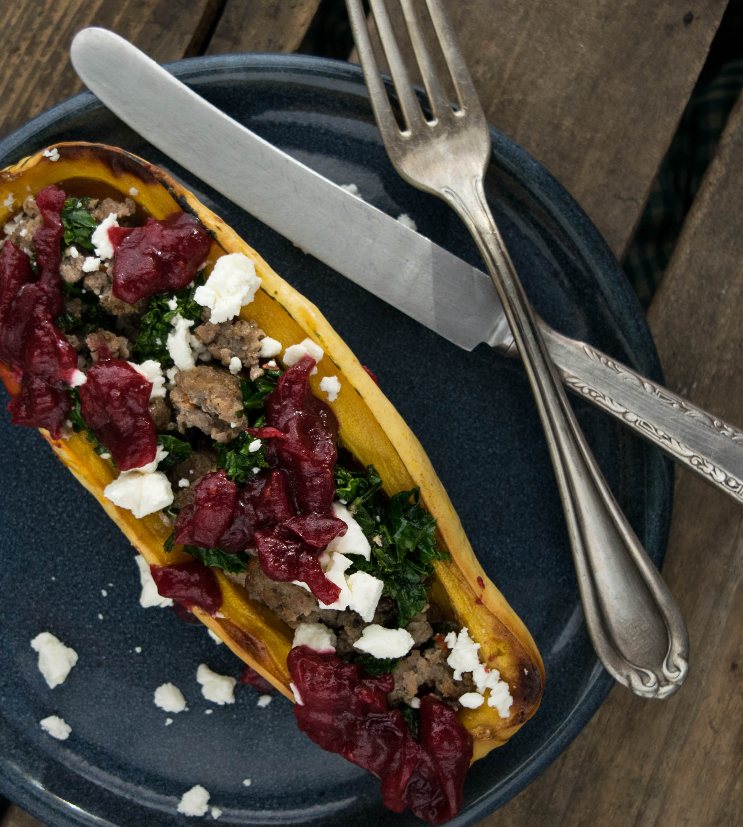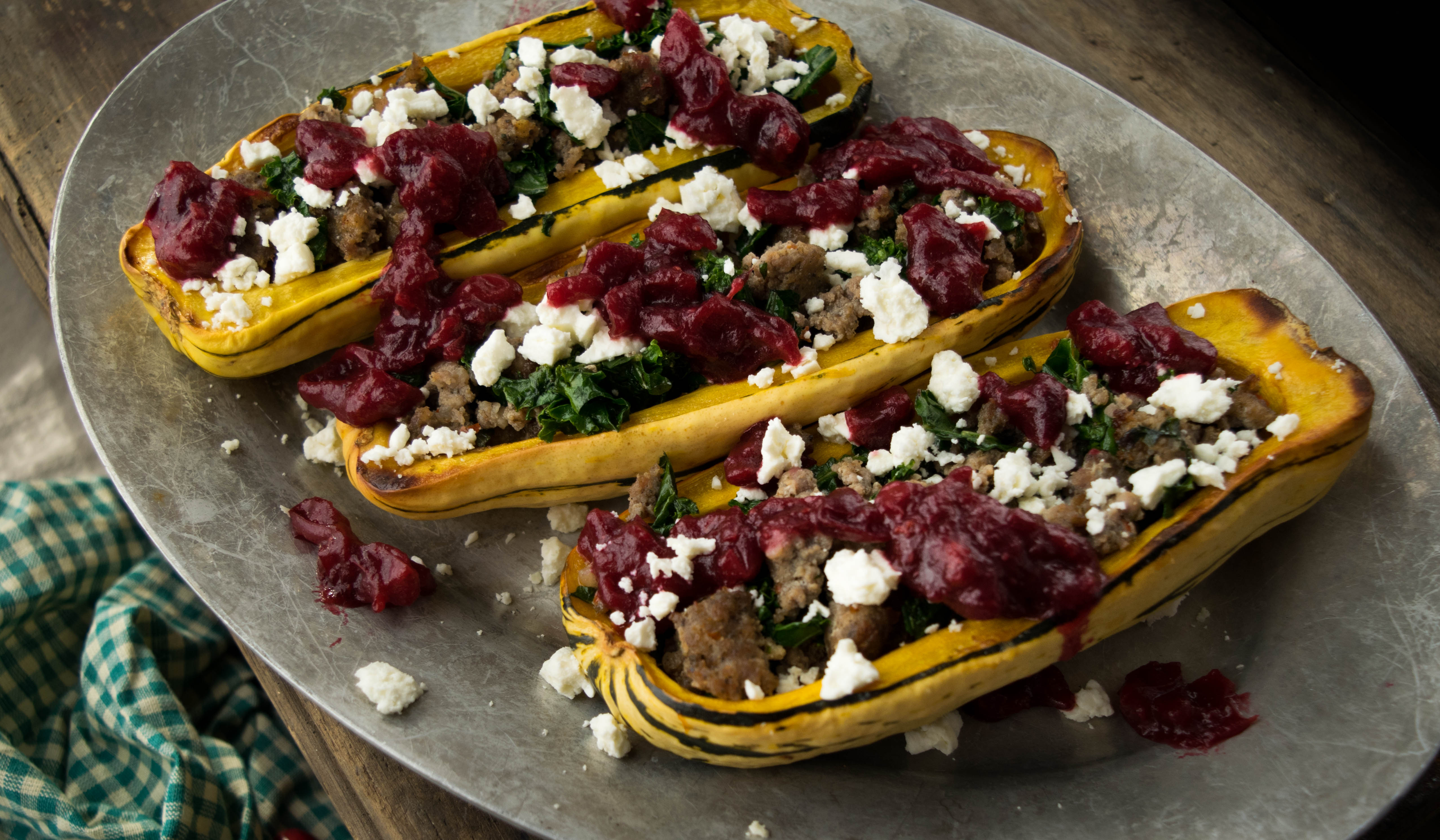 Roasted Delicata Boats with Ground Sausage, Feta, and Orange Cranberry Chutney