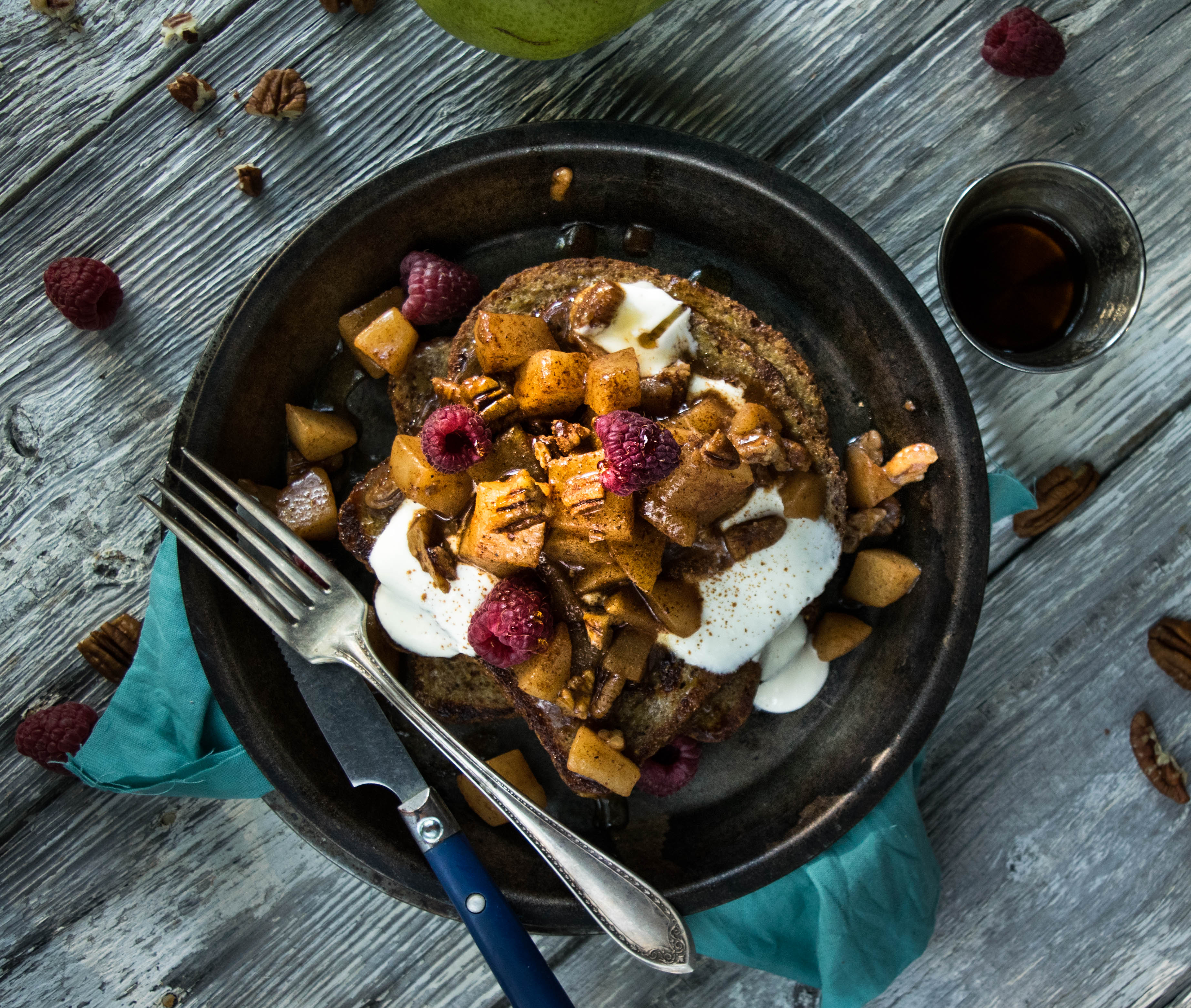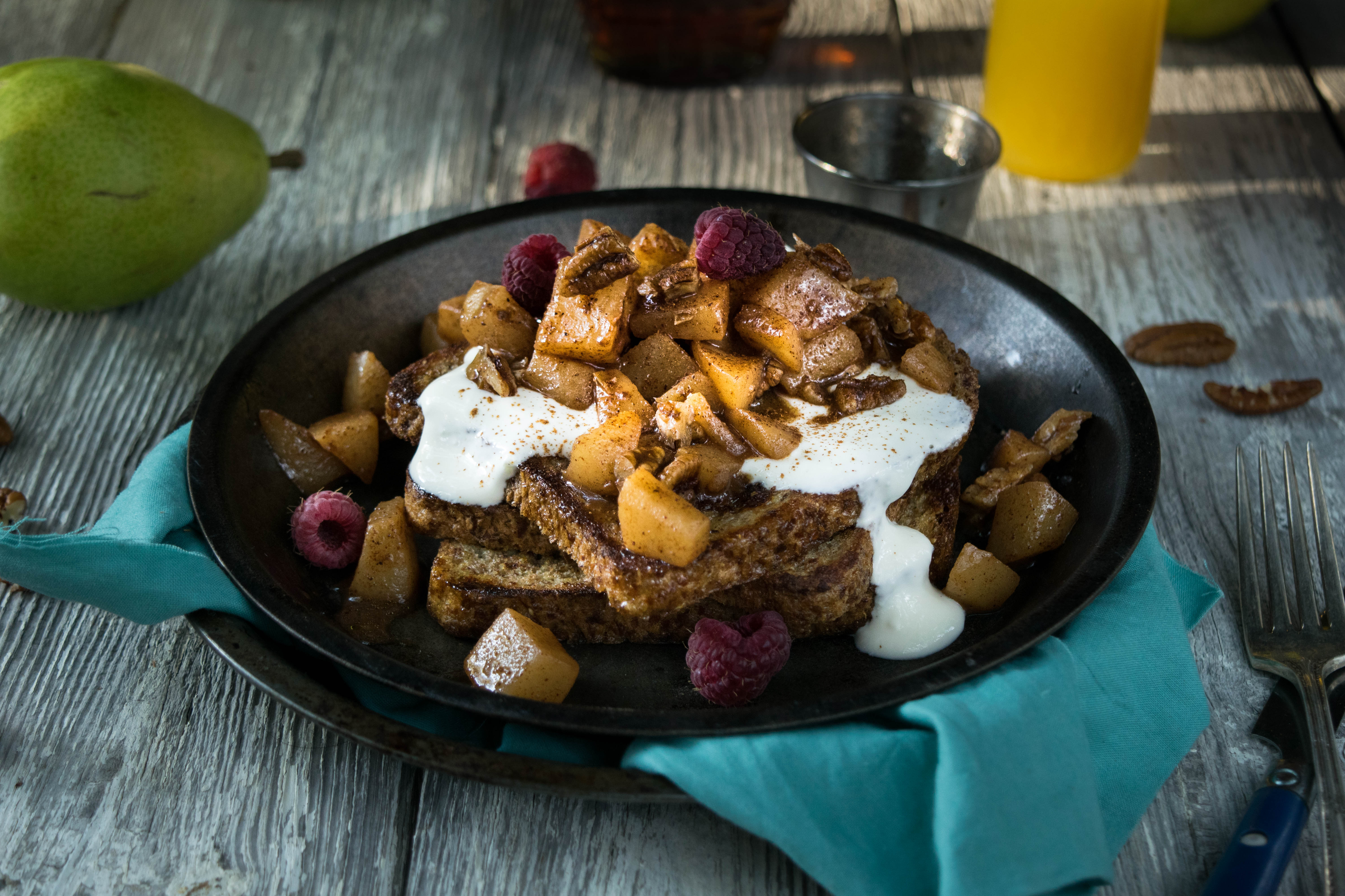 Sprouted French Toast with Creme Fraiche and Brandy-Pear-Pecan Compote