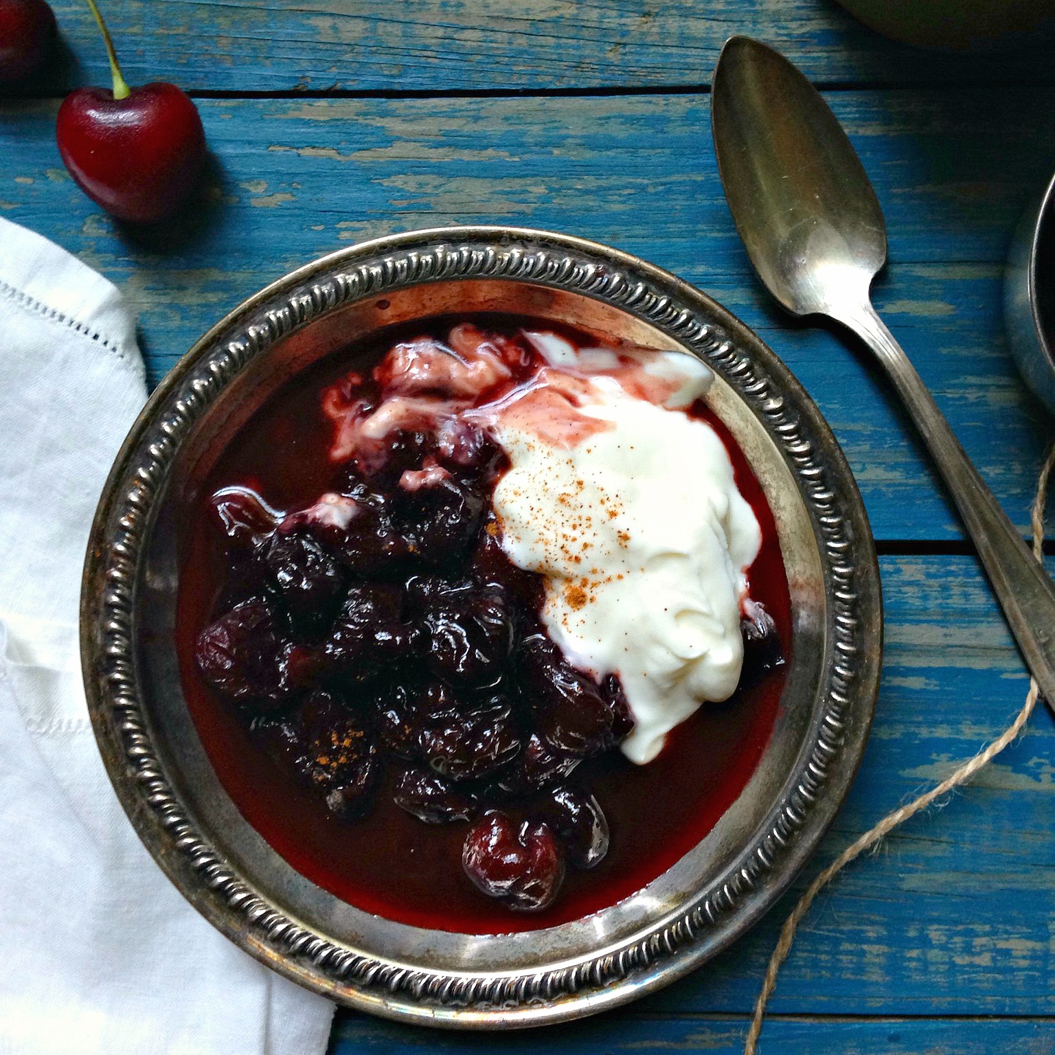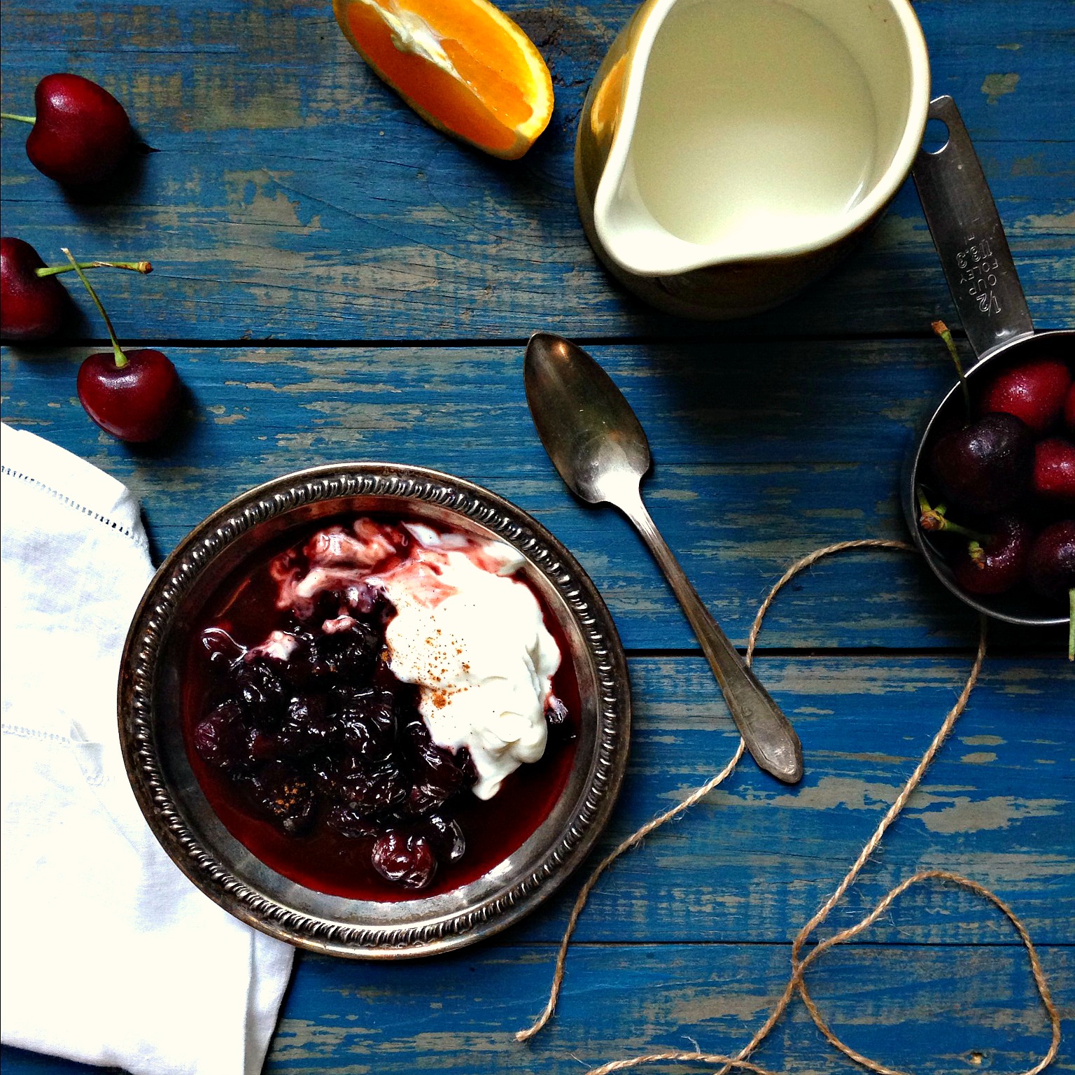 I anticipate cherry season all year, because there is nothing quite like sitting in the sunshine with a bowl of the little red gems to work on. But thanks to freezers, I enjoy this virgin cherries jubilee year round. Sweet enough to satisfy a dessert craving, and wholesome enough to have for breakfast.